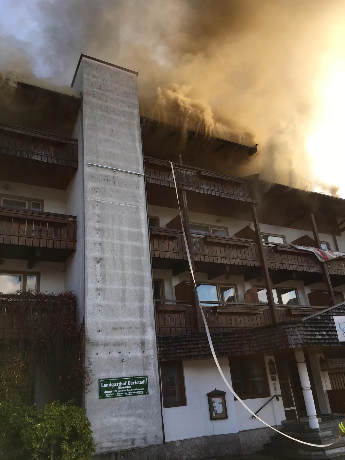Zu einem Großbrand wurden wir am Sonntag den 21.10.2018 um 13:54 von der Leitstelle Tirol alarmiert! Ein seit längerer Zeit leerstehendes Hotel mitten im Ortszentrum von Kössen stand im Bereich des 3 Stockes in Vollbrand! Laut Zeugenaussagen waren noch unmittelbar vor Brandausbruch Kinder gesehen worden daher suchte der 1 ATS-Trupp Umgehend das Gebäude nach Ihnen ab wobei aber niemand gefunden werden konnte. Vom Einsatzleiter sind weitere Feuerwehren nachalarmiert worden um genügend Atemschutzträger für den Innenangriff sowie zwei zusätzliche Drehleitern zur bereits alarmierten Hubrettungsbühne der Feuerwehr Reit im Winkl zu haben. Mit mehreren Atemschutztrupps wurde ein Innenangriff gestartet der Aufgrund von teilweiser Einsturzgefahr der Dachkonstruktion aber immer wieder unterbrochen werden musste. Zeitgleich fand ein umfassender Außenangriff von allen Seiten des Hotels statt sowie über die 3 Drehleitern! Um den Brand zu bekämpfen wurde im vorderen Teil des Daches mit Sogenannten FOG-Nails gearbeitet und im hinteren Teil wurde mit Kränen die Blechhaut des Daches entfernt um den Brand löschen zu können. Durch die enorme Rauchentwicklung am Boden durch ungünstige Windverhältnisse wurde die Bevölkerung über das Radio informiert Fenster und Türen zu schließen. Um sicher zu gehen das keine Gefahr für die Bevölkerung besteht führte der Messzug Süd der FF Traunstein Messungen in den betroffenen Gebieten durch wobei keine erhöhten Werte festgestellt werden konnte.