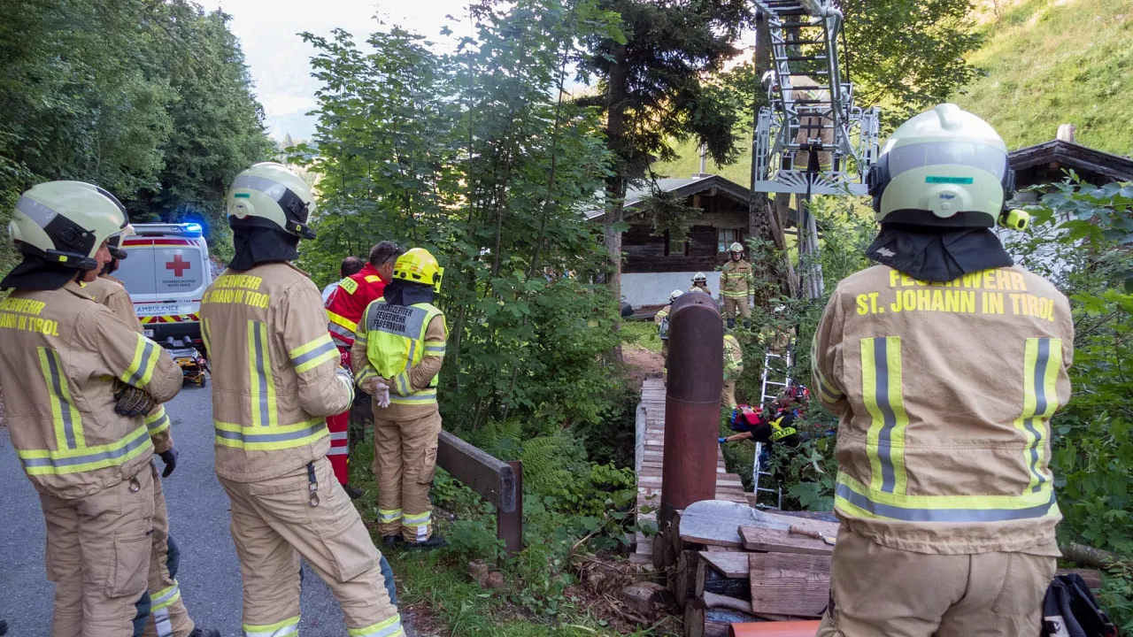 der Lage war, sich aus dem Bach aus eigener Kraft zu befreien, wurde der Notruf abgesetzt. Die alarmierten Kräfte der Feuerwehren Fieberbrunn und St. Johann sowie des Rettungsdienstes begannen umgehend mit der Erstversorgung des Patienten. Mittels Drehleiter konnte die verletzte Person in kurzer