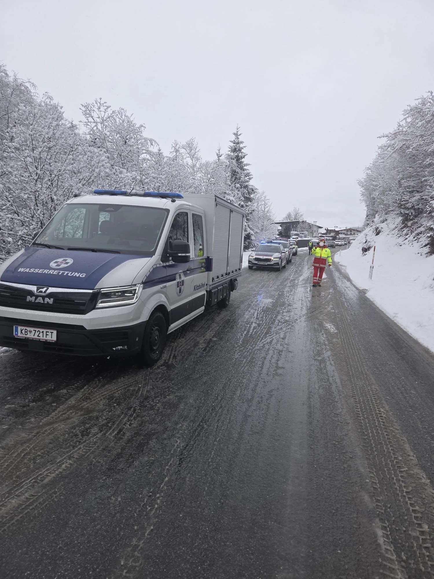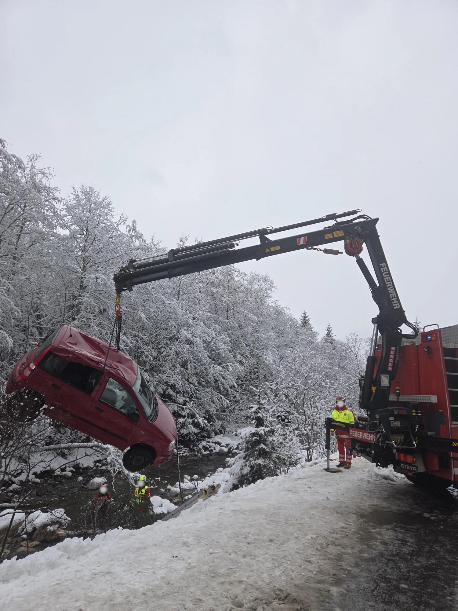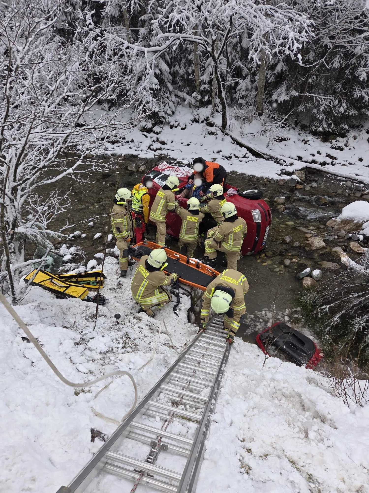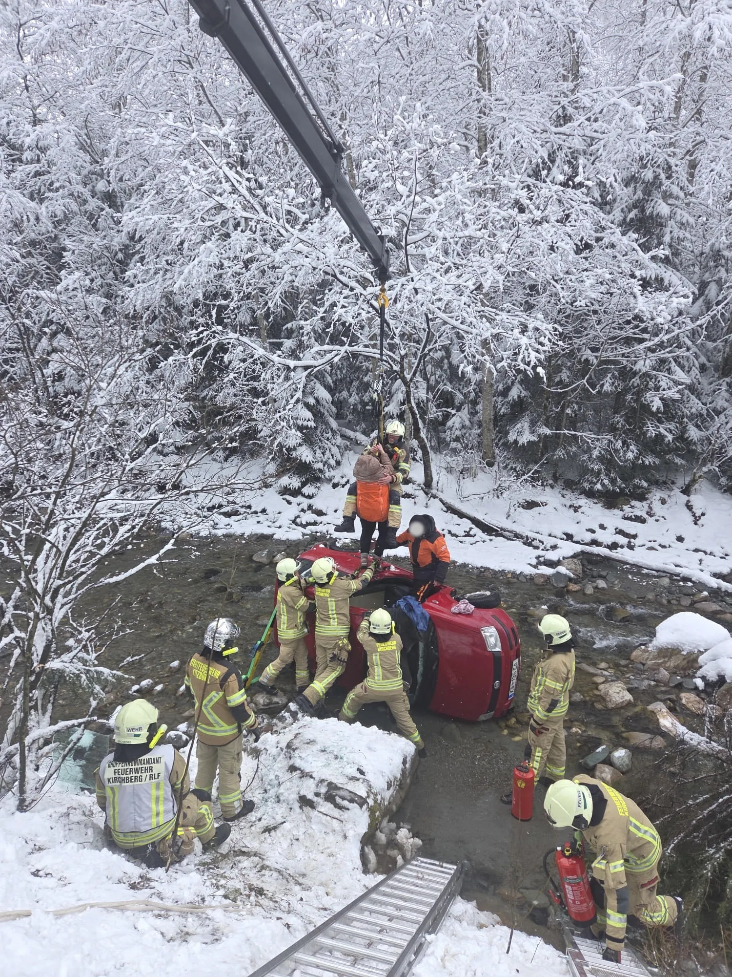 Beim Eintreffen der ersten Einsatzkräfte zeigte sich folgende Lage: Ein Pkw war auf schneebedeckter Fahrbahn ins Schleudern geraten, von der Straße abgekommen und über die steile Böschung in die parallel zur Fahrbahn verlaufende Aschauer Ache gestürzt. Das Fahrzeug überschlug sich und kam schließlich auf der Beifahrerseite im Flussbett zum Stillstand. Eine Person konnte sich selbststandig aus dem Unfallfahrzeug befreien. Ein vorbeifahrendes Mitglied der Pistenrettung der Bergbahn AG Kitzbühel übernahm die Erstversorgung und die Rettungskette wurde in Gang gesetzt. Die zweite Person war im Fahrzeug eingeschlossen und musste von den Einsatzkräften befreit werden. Als erstes wurde das Fahrzeug stabilisiert und gegen Wegrutschen gesichert. Um einen möglichst schonenden Zugang zu schaffen, wurde die Frontscheibe mithilfe einer Sabelsäge entfernt. Anschließend konnte die Patientin mithilfe des Krans des SRF Kitzbühel achsengerecht aus dem Fahrzeug gehoben und dem Rettungsdienst übergeben werden. Nach der Personenrettung wurde das schwer beschädigte Fahrzeug aus dem Flussbett geborgen, um mögliche Umweltschäden zu vermeiden, auf der Fahrbahn abgestellt und gegen Wegrollen gesichert.